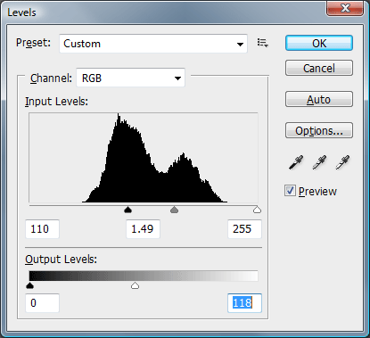 Drag the Black Point slider (the little black one) towards the centre. This defines a new black for your image. Any colours at that point on the graph (or to the left of it), will now be pitch black.